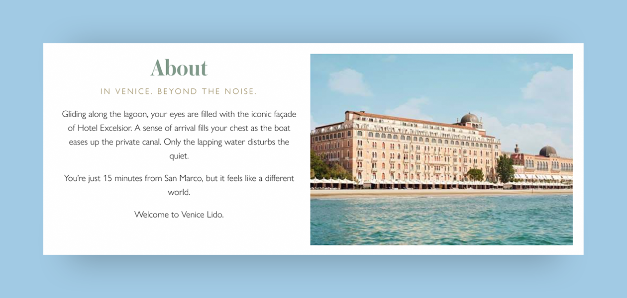 A great example is our recent work with Hotel Excelsior in Venice. It’s a five-star hotel and beach resort just a few minutes from the bustling, historic centre of Venice. It would be easy to vapidly describe the benefits. To say, “we’re an extraordinary oasis of calm”.